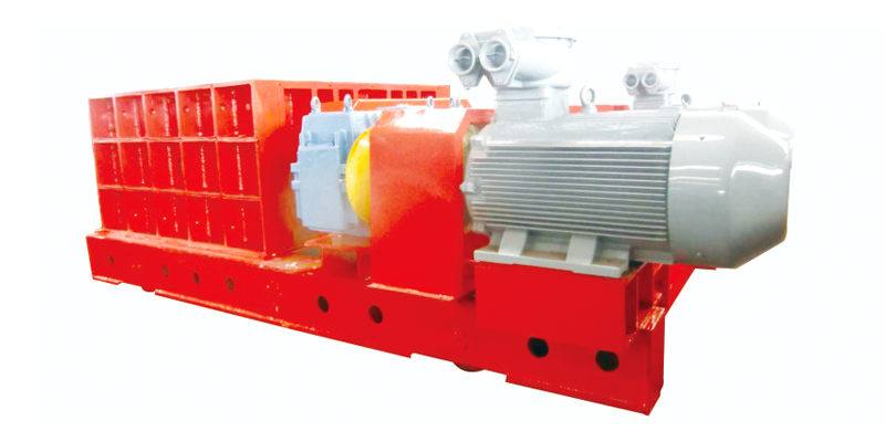 破碎機(jī)由兩臺(tái)電動(dòng)機(jī)將動(dòng)力經(jīng)減速器減速后分別驅(qū)動(dòng)兩齒輥相向旋轉(zhuǎn),當(dāng)物料從入料口進(jìn)入機(jī)體破碎腔時(shí),帶有螺旋齒牙的兩齒輥首先將物料篩分,符合要求的物料通過(guò)齒間進(jìn)入排料溜槽。大塊物料受齒輥齒牙的劈裂、剪切,